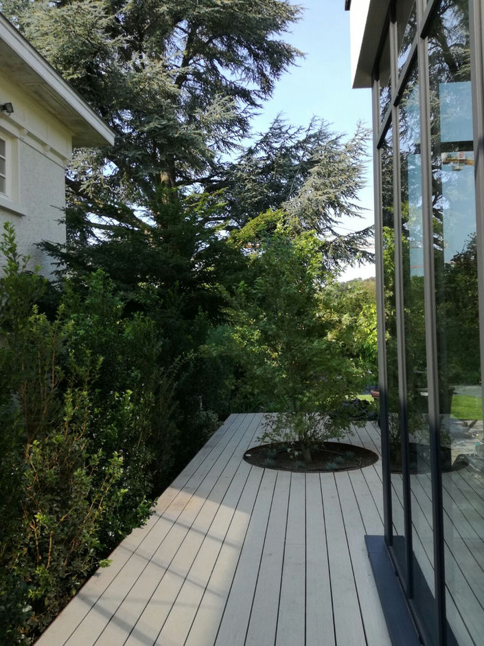 L'échelle urbaine a été doublement affrontée car la façade coté rue a été complètement repensée (enlèvement du terre-plein antérieur et ajout d'une fenêtre qui nous permet d'augmenter la surface habitable de la maison). Coté arrière nous avons construit une extension afin de faire déborder le salon dans le grand jardin. La toiture a été également refaite afin d'introduire des lucarnes rampantes et ainsi gagner en volumétrie et surface habitable. A l'intérieur l'aménagement de la maison se développe en étoile autour d'un corps escalier. Cet escalier, colonne vertebrale de la maison, est en verre et permet à la lumière provenant du puit en verre en toiture de le traverser.